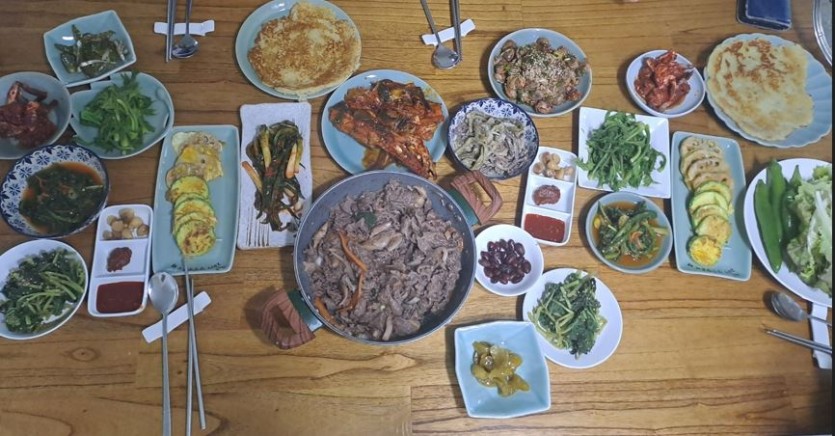 저녁은 여행의 고단함에 지쳐서 들어오는 손님을 위해 정성껏 차린 상다리가 부러지는 식사에 과일, 갖은 나물들과 소불고기, 후식까지 준비해주시는 세심함과,