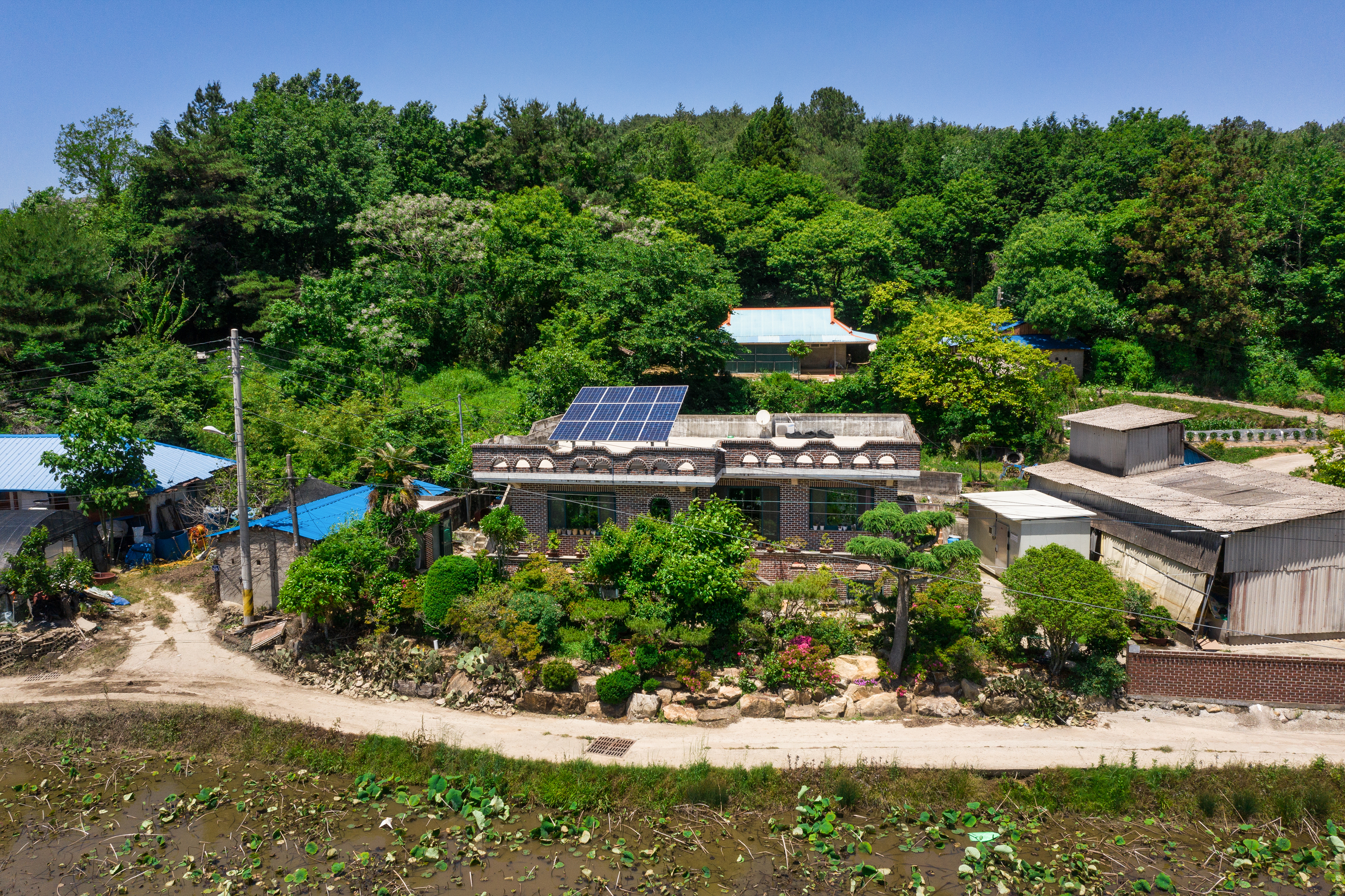 바다까지 논밭이 펼쳐져 있고, 산너머에는 다산초당이 있어요. 저녁에는 개구리 소리가 들리고 겨울에는 오리와 철새들이 날아와서 장관이라고 합니다. 자연의 소리가 가득한 집이에요.